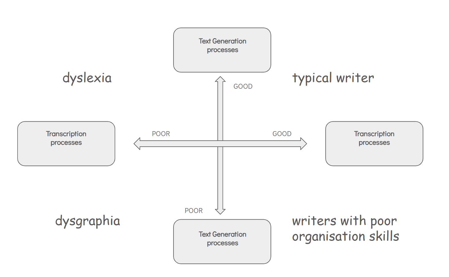 The quadrants above can offer a framework for understanding the distinct challenges faced by each group. For instance, a student with dysgraphia may have brilliant ideas but struggle with the mechanical act of writing, organising, and forming a coherent text. A student with dyslexia may have brilliant ideas but find it hard to transcribe them accurately due to spelling and decoding difficulties. Writers with poor organisational skills or executive function skills may have good spelling and handwriting, however, struggle to come up with coherent ideas and be able to logically put them together. Finally, a good writer will be able to generate good written prose, along with having good handwriting and spelling.
