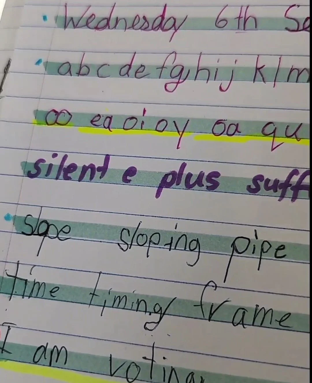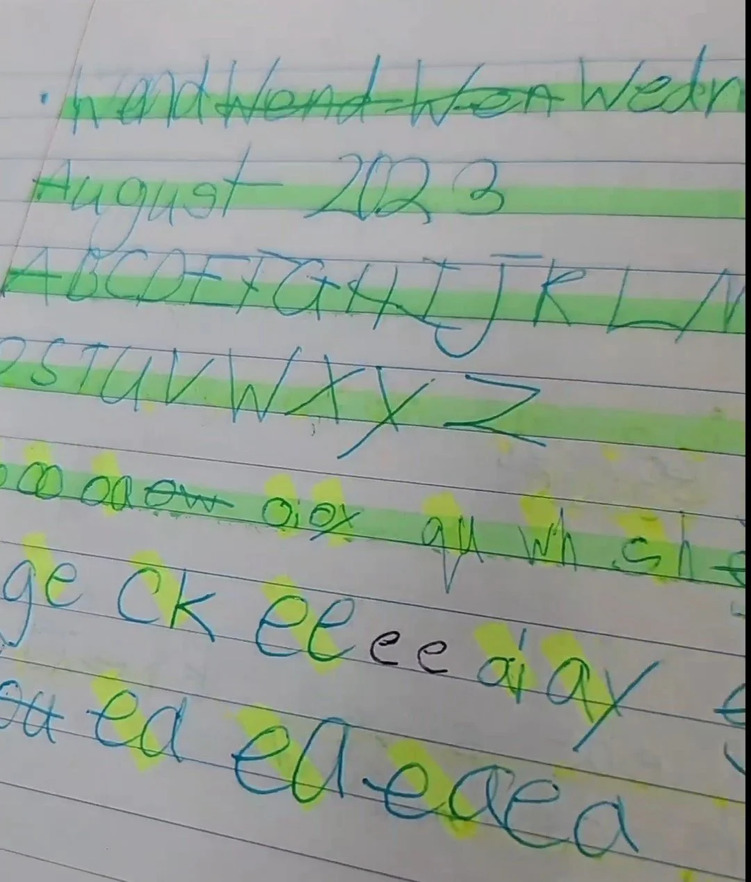 As you can see, I started introducing multiple sounds for spellings, (ea, ea, ea) and it became increasingly challenging for her to map these sounds or make sense of the sound-symbol correspondence. In the next image, my student chose not to write; she actually chose to tick instead. I had introduced oo/oo straight after ea/ea/ea. This clearly demonstrates the impact of cognitive load. I had overloaded her with too many sounds, and there was too much to think about, causing her to struggle with things she had previously mastered. This was a significant warning sign to me. In the images below, the student struggled to write the date and the uppercase alphabet and then chose to tick instead of write. This led me to abandon the lesson I had planned.